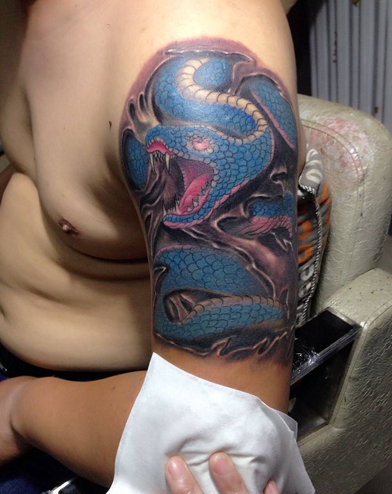 • T网红王老大花腿龙纹身图片_腿部新传统纹身图案