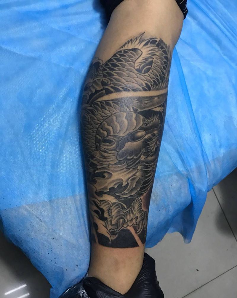 • T网红王老大花腿龙纹身图片_腿部新传统纹身图案