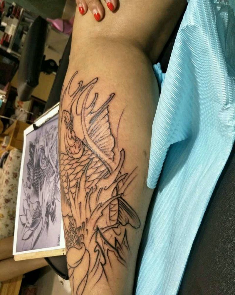 小腿外侧锦鲤纹身图片