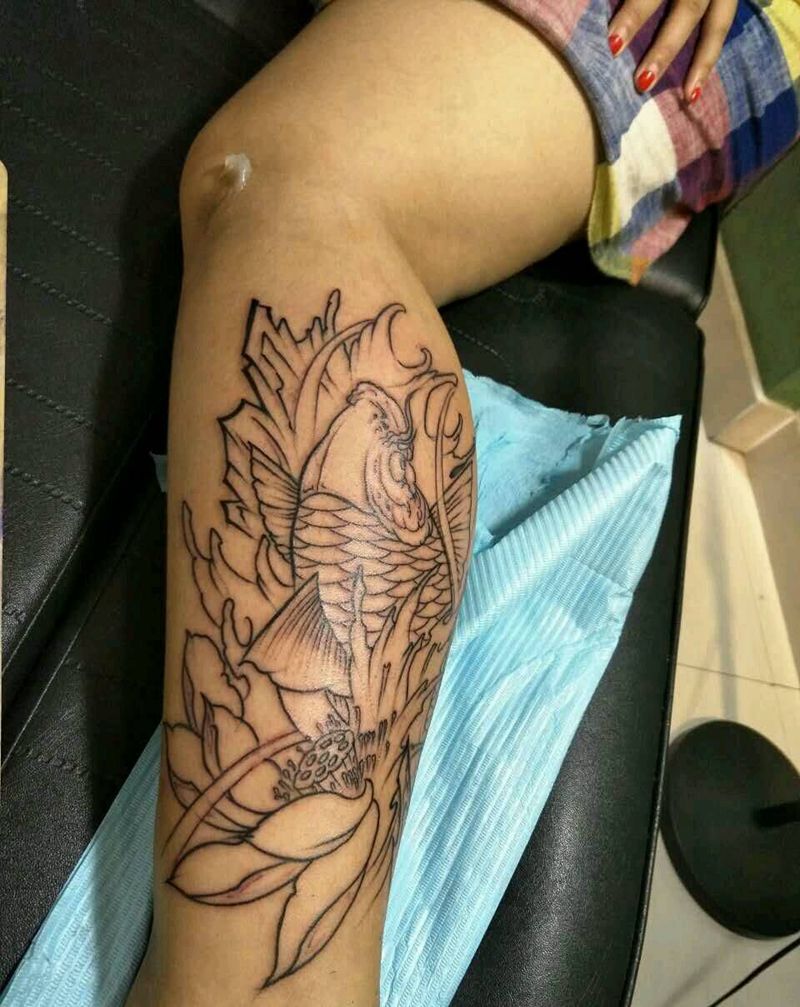 小腿外侧锦鲤纹身图片