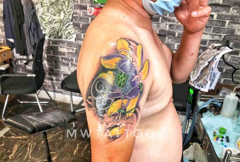 当前位置: 首页 >山东省菏泽市纹身店-菏泽墨舞刺青工作室纹身图案>荷花纹身图片_手臂新传统纹身图案