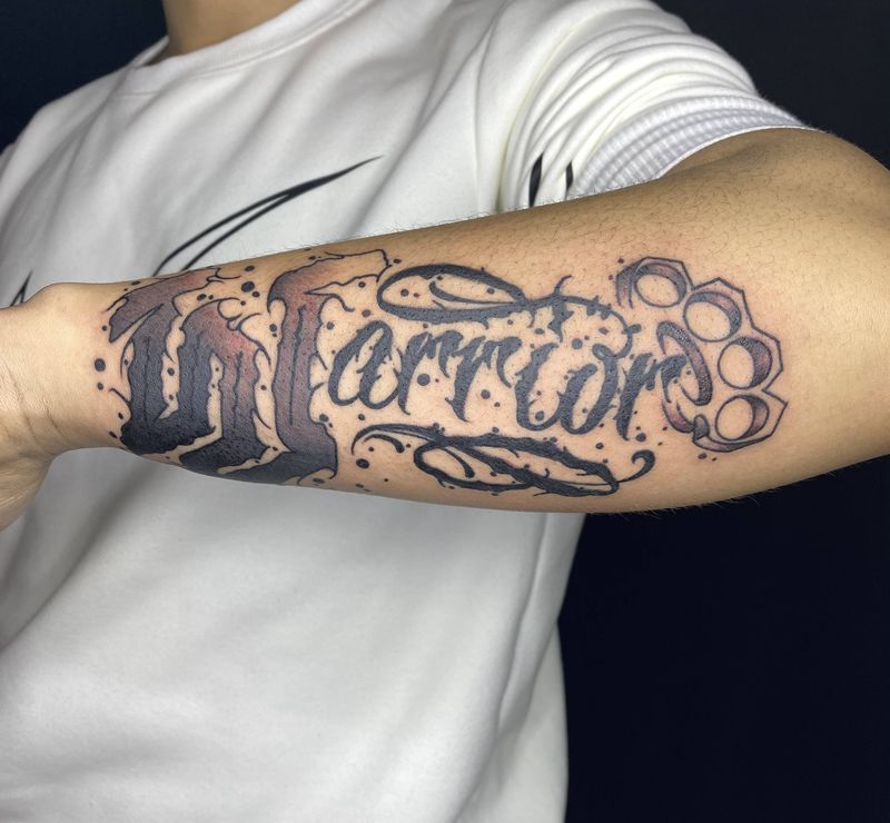 当前位置: 首页 >山东省德州市纹身店-德州小伟刺青纹身图案>勇士纹身图片_手臂花体字纹身图案