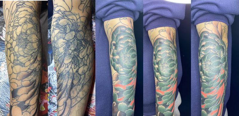 当前位置: 首页 >山东省德州市纹身店-德州小伟刺青纹身图案>菊花遮盖未完纹身图片_手臂老传统纹身图案