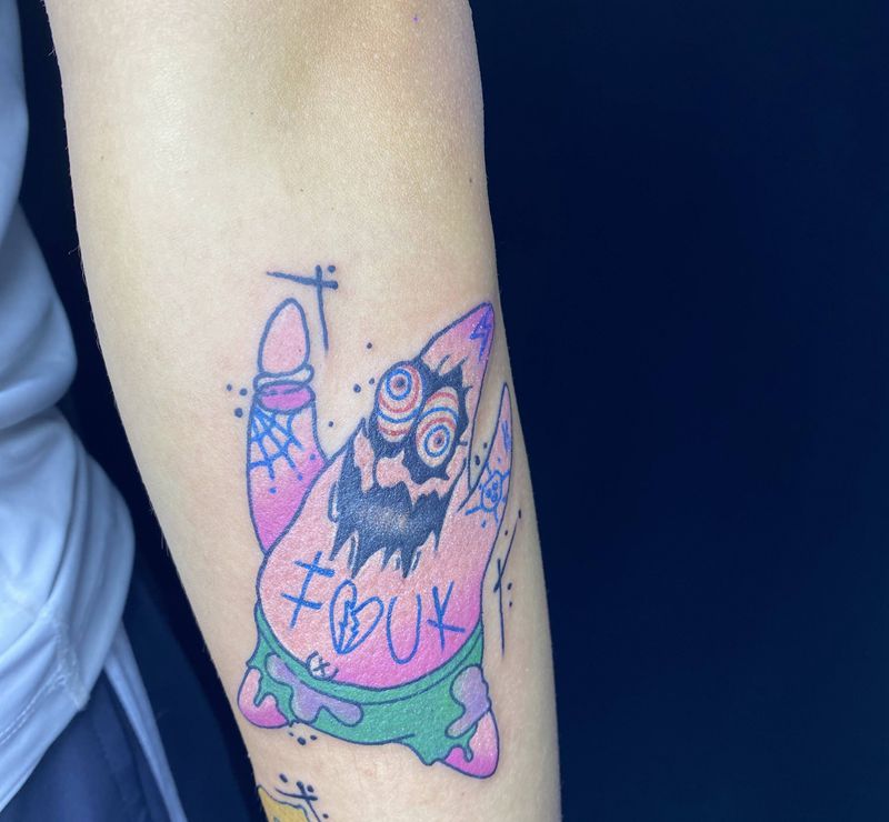 当前位置: 首页 >山东省德州市纹身店-德州小伟刺青纹身图案>海绵宝宝与派大星纹身图片_手臂New School纹身图案
