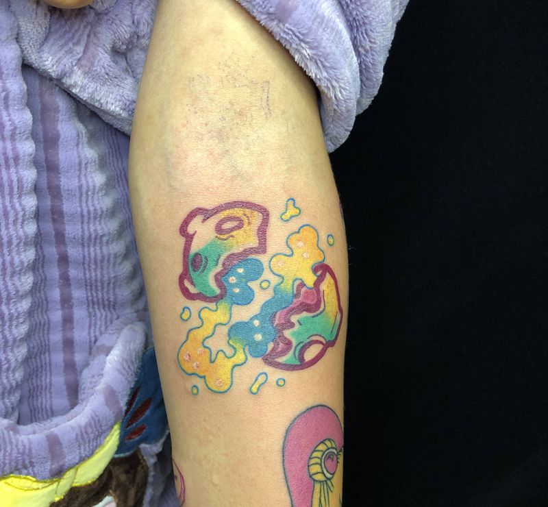 当前位置: 首页 >山东省德州市纹身店-德州小伟刺青纹身图案>拼接纹身图片_手臂New School纹身图案