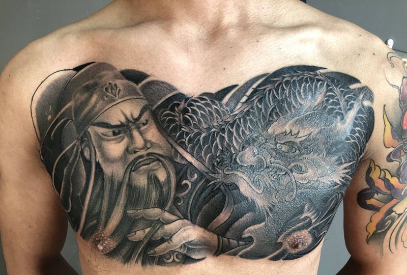 当前位置: 首页 >山东省德州市纹身店-德州小伟刺青纹身图案>关公龙花胸纹身图片_新传统纹身图案