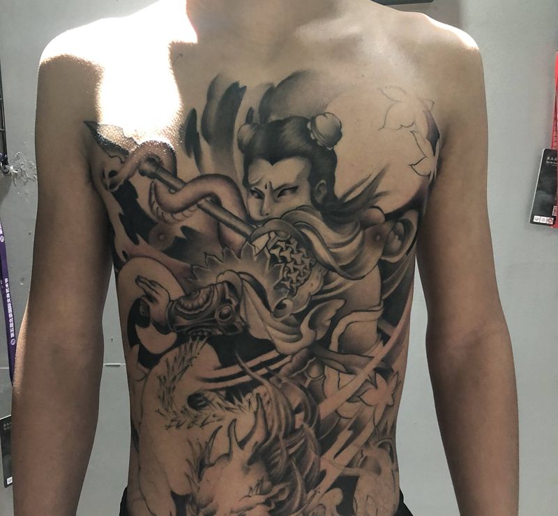 哪吒未完成纹身图片_胸部新传统纹身图案