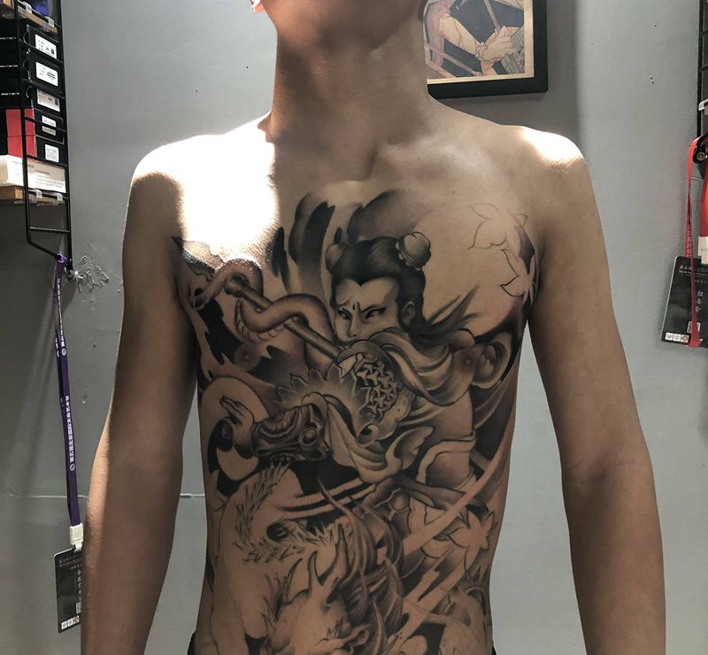 哪吒未完成纹身图片_胸部新传统纹身图案