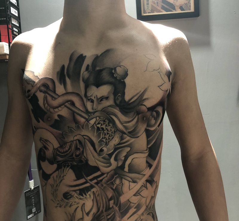 哪吒未完成纹身图片_胸部新传统纹身图案