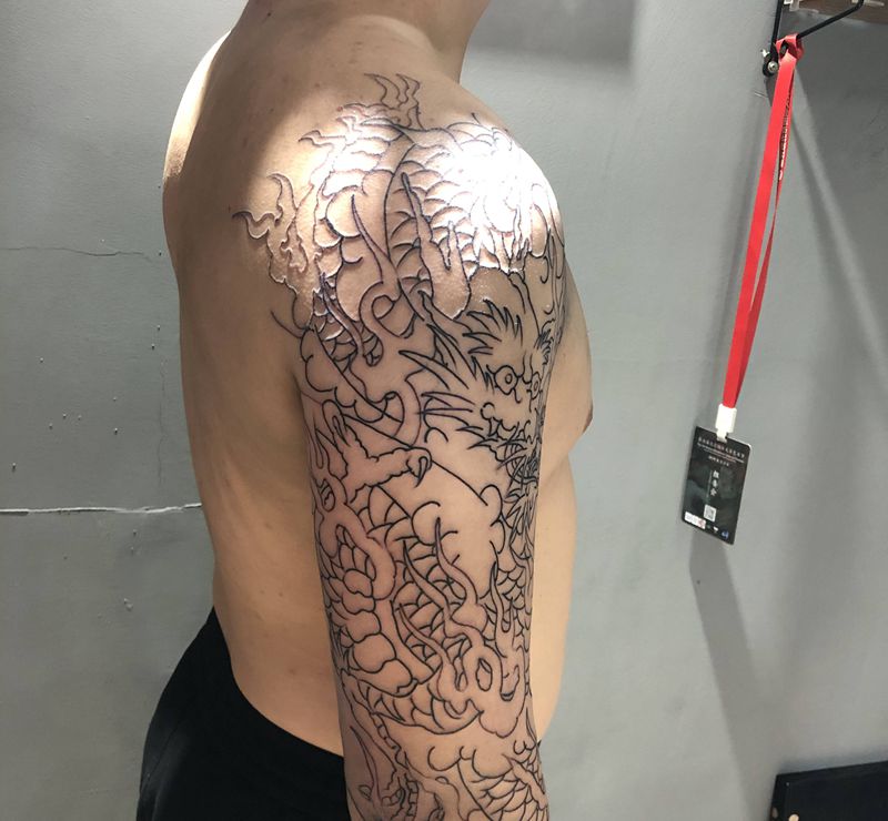 • T网红王老大花腿龙纹身图片_腿部新传统纹身图案