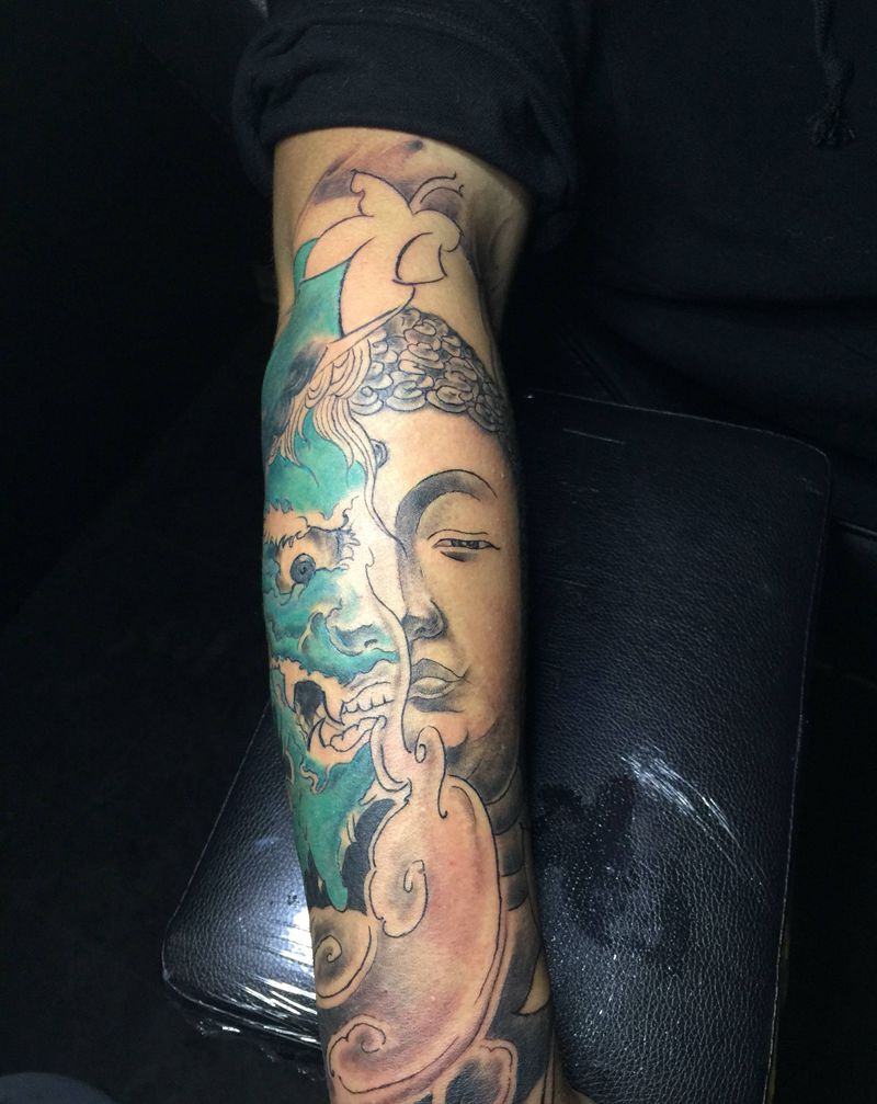 当前位置: 首页 >山东省菏泽市纹身店-宜霖刺青工作室纹身图案>善恶纹身图片_手臂新传统纹身图案