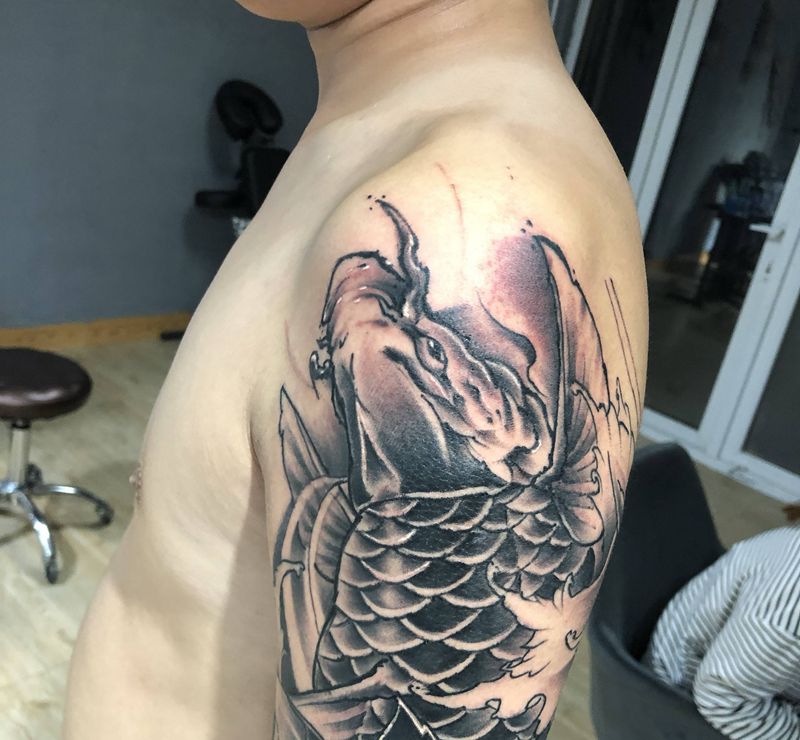 当前位置: 首页 >山东省聊城市纹身店-D•刺青纹身图案>锦鲤纹身图片_肩部手臂新传统纹身图案