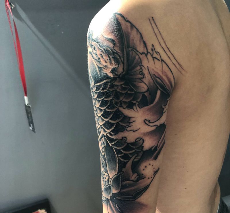 当前位置: 首页 >山东省聊城市纹身店-D•刺青纹身图案>锦鲤纹身图片_肩部手臂新传统纹身图案