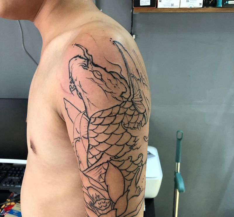 当前位置: 首页 >山东省聊城市纹身店-D•刺青纹身图案>锦鲤纹身图片_肩部手臂新传统纹身图案