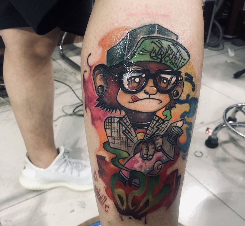• T包小腿吹火男+阿多福纹身图片_腿部老传统新传统吹火男阿