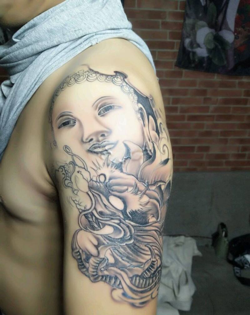 佛,未完成的样子纹身图片_肩部手臂新传统纹身图案