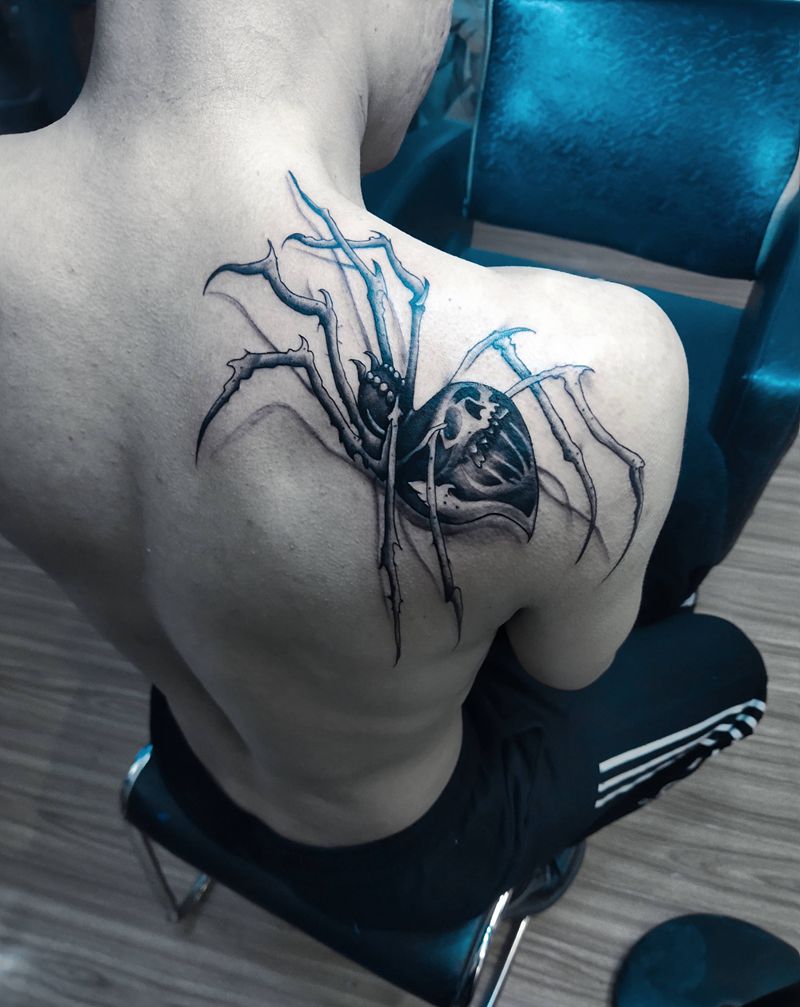 当前位置: 首页 >山东省德州市纹身店-针艺舍刺青工作室纹身图案>大蜘蛛纹身图片_肩部新传统欧美写实纹身图案