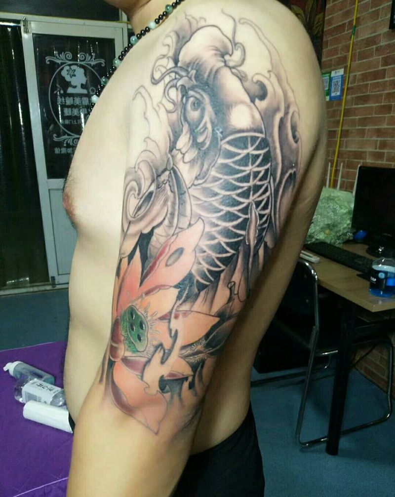 当前位置: 首页 >山东省德州市纹身店-针艺舍刺青工作室纹身图案>招财锦鲤纹身图片_手臂新传统纹身图案