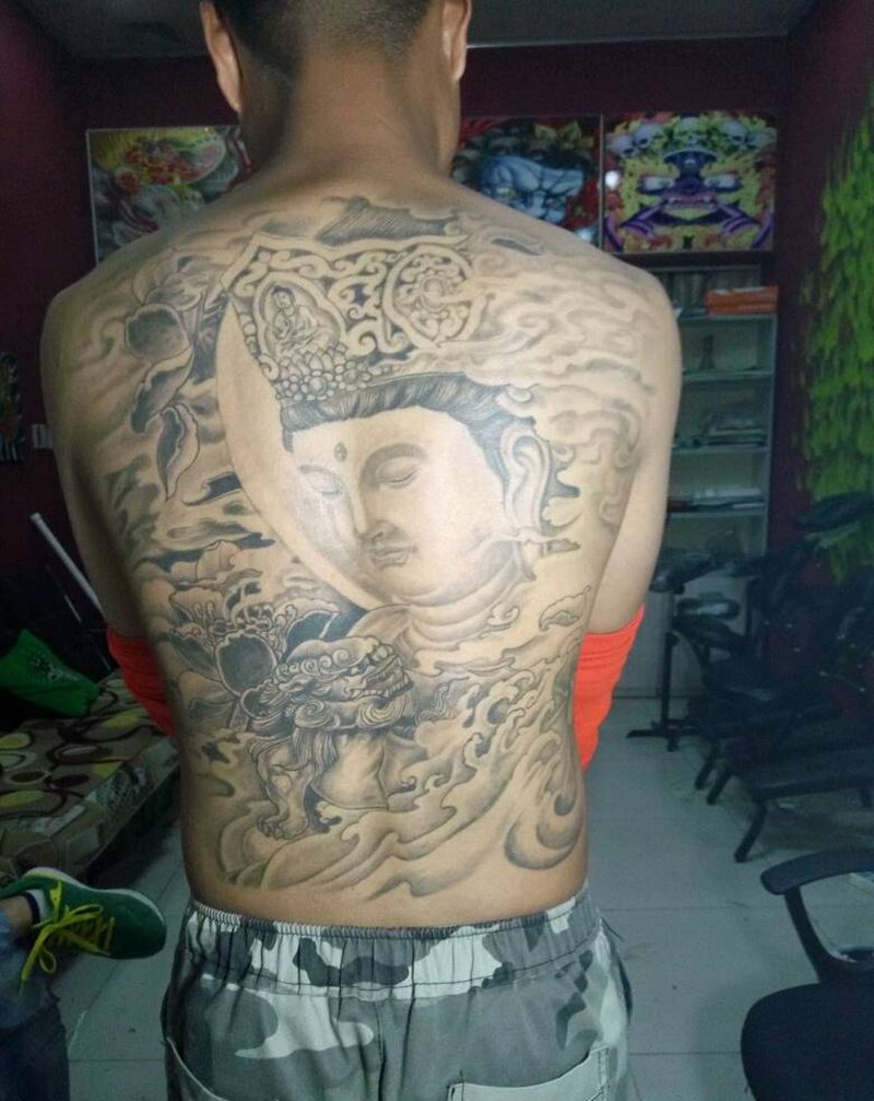 当前位置: 首页 >山东省滨州市纹身店-滨州惠民一铭纹身纹身图案>满背文殊菩萨纹身图片