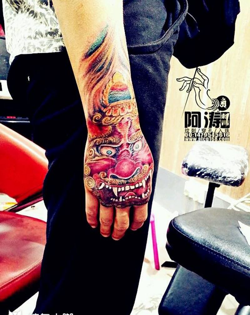 包手唐狮 痛并快乐着 一次完成纹身图片_手部传统动物纹身图案