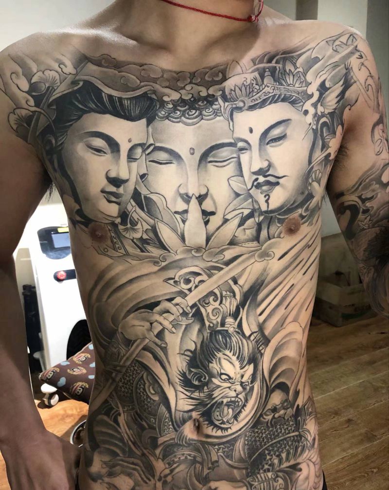 三面佛 齐天大圣纹身图片_腹部新传统纹身图案