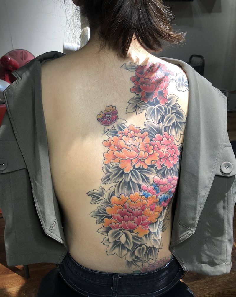 未完成纹身图片_背部新传统牡丹花纹身图案