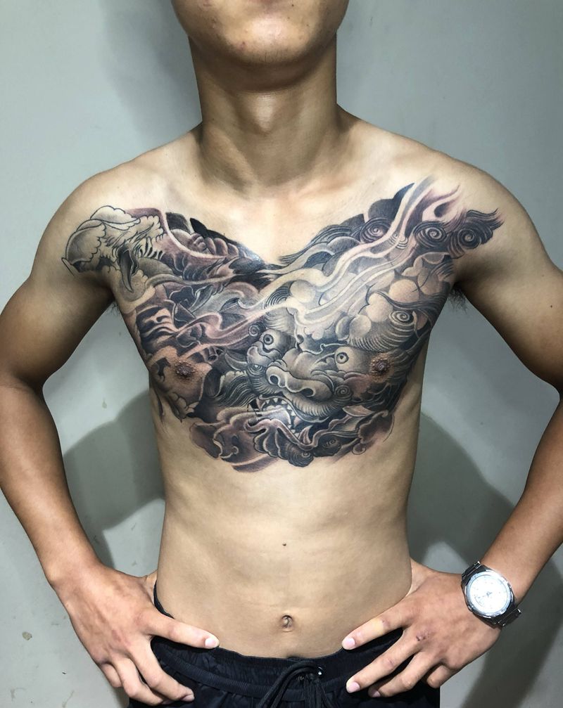 唐狮纹身图片_胸部新传统纹身图案