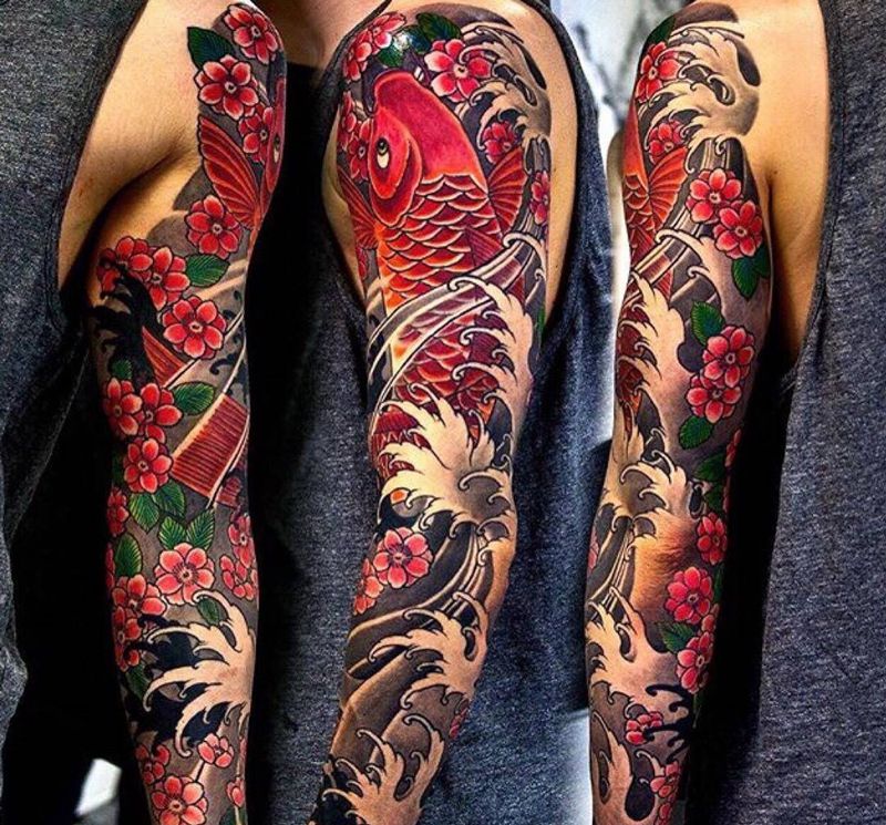 当前位置: 首页 >山东省菏泽市纹身店-菏泽麒麟刺青纹身图案>最帅之花臂纹身图片_成品手臂传统植物动物纹身图案