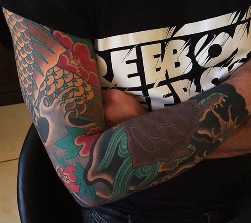 当前位置: 首页 >山东省菏泽市纹身店-菏泽麒麟刺青纹身图案>最帅之花臂纹身图片_成品手臂传统植物动物纹身图案