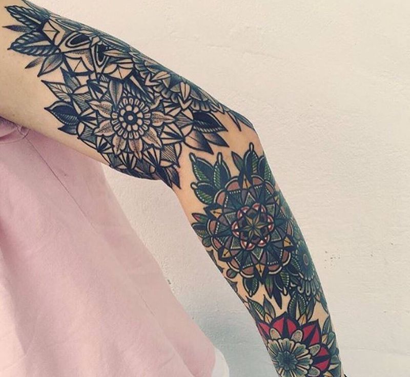 当前位置: 首页 >山东省菏泽市纹身店-菏泽麒麟刺青纹身图案>最帅之花臂纹身图片_成品手臂传统植物动物纹身图案