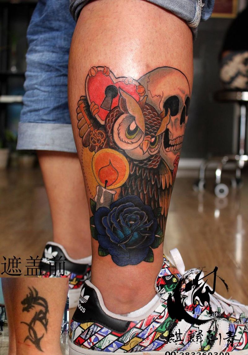 暴力遮盖图腾纹身图片_成品腿部欧美动物纹身图案