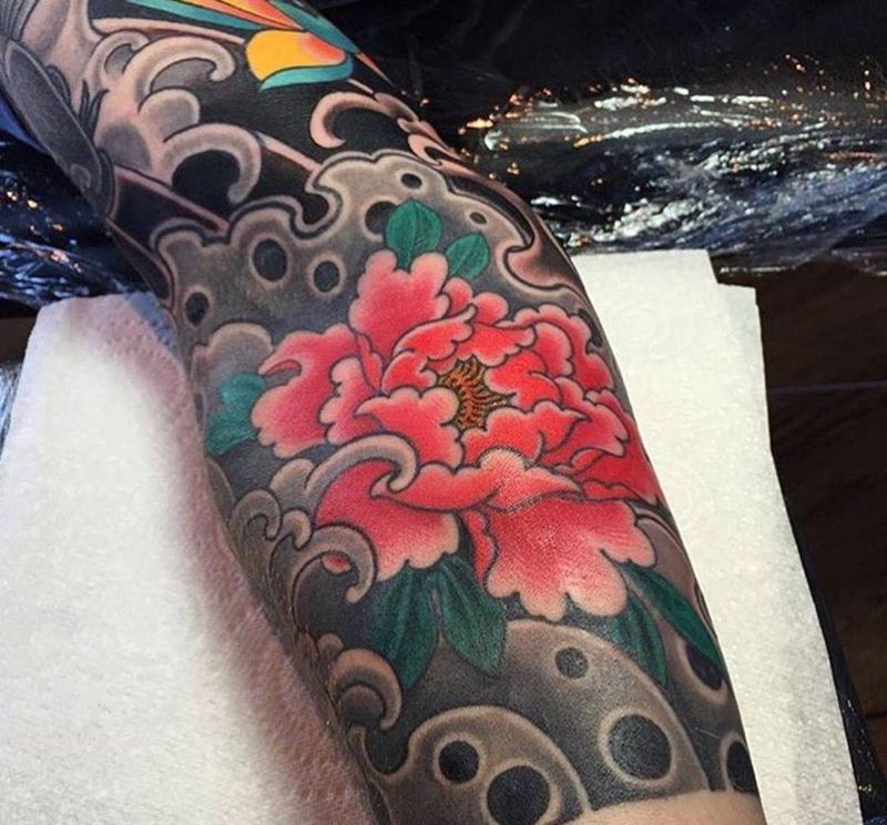 来点干货,传统欣赏纹身图片_手臂成品背部腿部传统植物花卉锦鲤牡丹般若纹身图案
