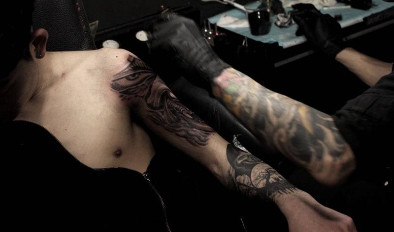 夏天必备单品,花臂纹身图片_成品手臂宗教鬼神黑灰纹身图案