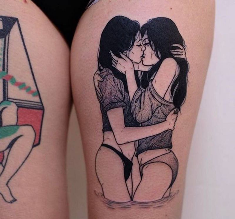 《自.我》纹身图片_成品人物腿部腰部简约黑灰纹身图案