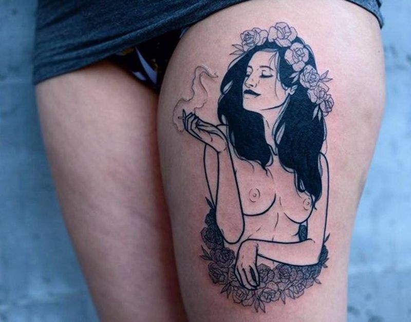当前位置: 首页 >山东省菏泽市纹身店-菏泽麒麟刺青纹身图案>《自.我》纹身图片_成品人物腿部腰部简约黑灰纹身图案