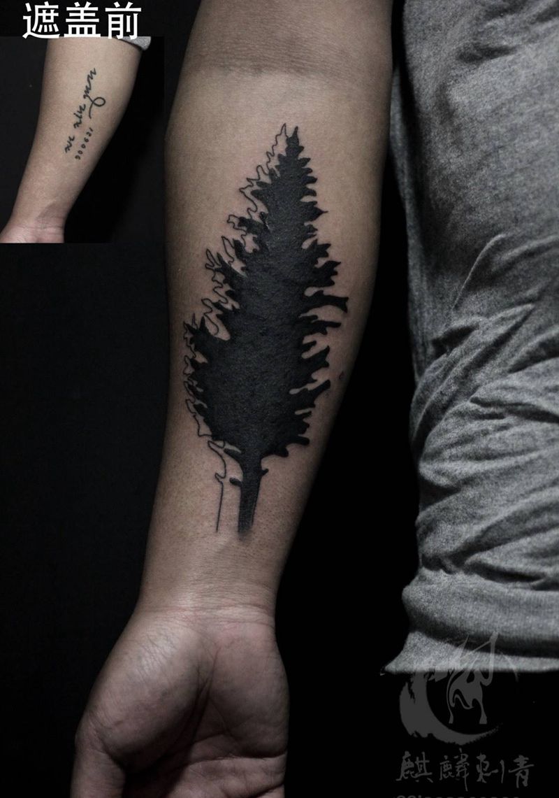 当前位置: 首页 >山东省菏泽市纹身店-菏泽麒麟刺青纹身图案>松树纹身图片_成品遮盖简约黑灰植物清新手臂纹身图案