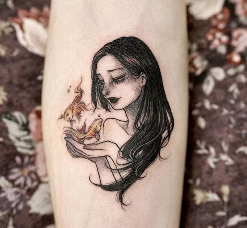 当前位置: 首页 >山东省菏泽市纹身店-菏泽麒麟刺青纹身图案>《心·思》纹身图片_成品清新手臂人物彩色黑灰纹身图案