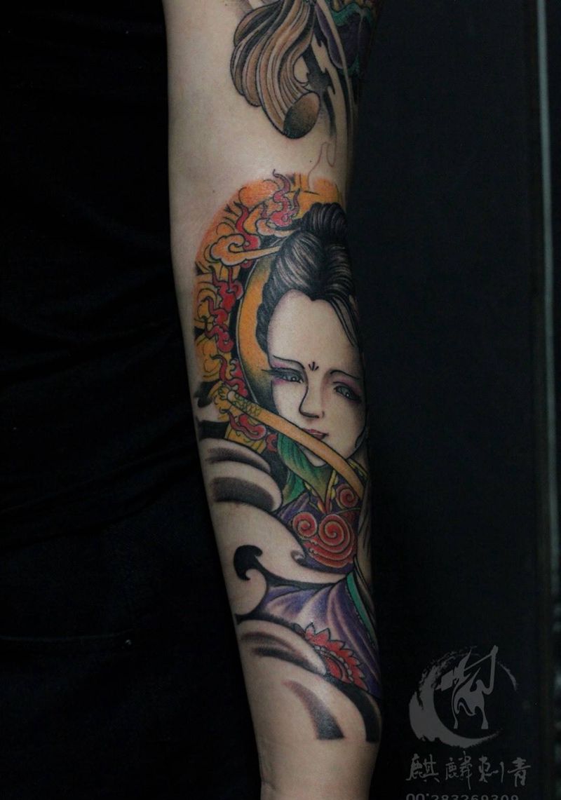 当前位置: 首页 >山东省菏泽市纹身店-菏泽麒麟刺青纹身图案>艺妓纹身图片_成品手臂传统彩色花卉人物般若艺妓纹身图案