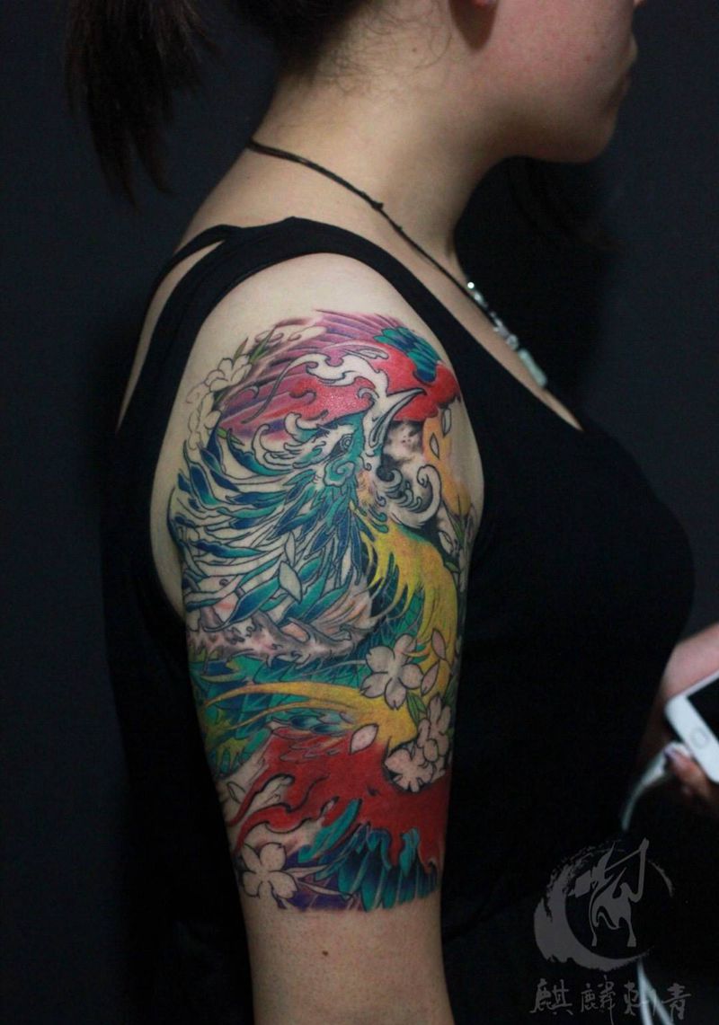 当前位置: 首页 >山东省菏泽市纹身店-菏泽麒麟刺青纹身图案>凤凰未完成 遮盖纹身图片_手臂传统动物彩色遮盖纹身图案