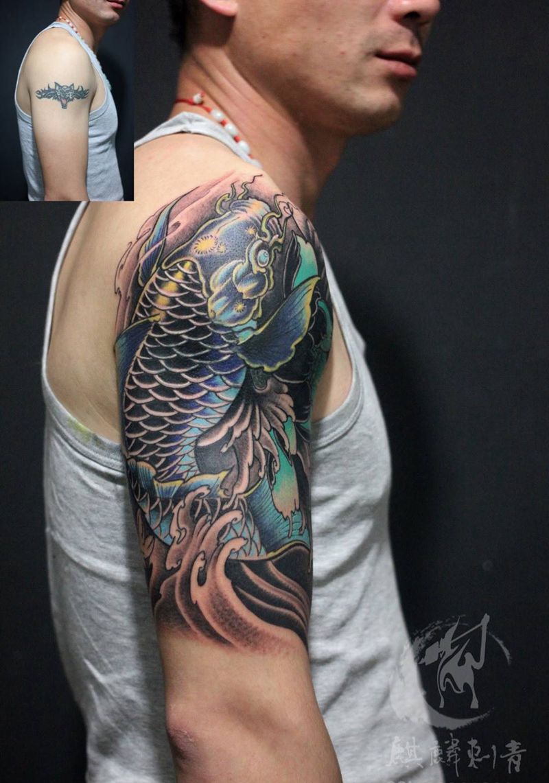 当前位置: 首页 >山东省菏泽市纹身店-菏泽麒麟刺青纹身图案>遮盖狼头纹身图片_成品手臂传统动物彩色遮盖锦鲤鱼纹身图案