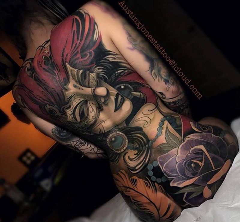 满背通体欣赏纹身图片_成品背部臀部腿部手臂欧美传统人物彩色动物纹身图案