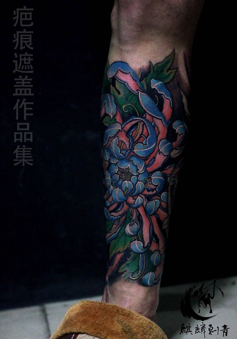 重彩疤痕遮盖纹身图片_成品腿部传统植物遮盖彩色菊花疤痕花卉纹身图案