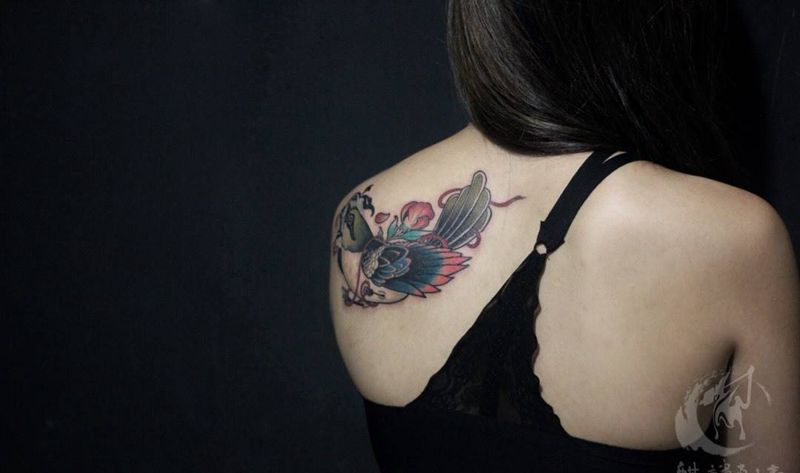 鸟纹身图片_成品背部传统动物清新彩色纹身图案