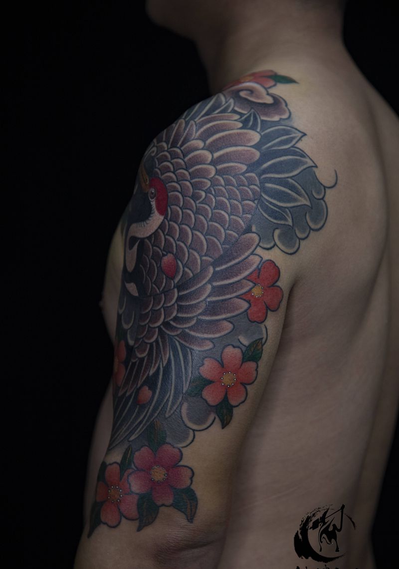 日式仙鹤纹身纹身图片_肩部手臂老传统仙鹤纹身图案