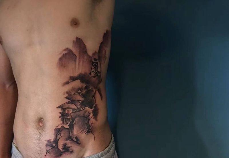 侧腰水墨画纹身图片_腰部水墨纹身图案