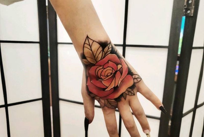 手背玫瑰纹身图片_手部New School纹身图案