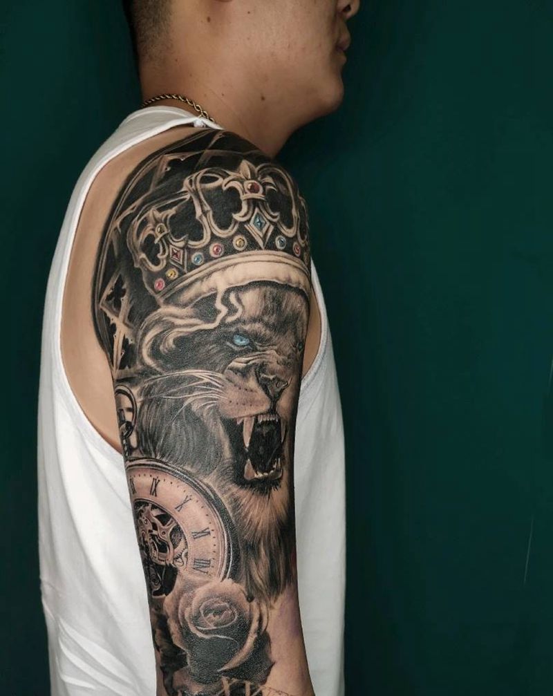 当前位置: 首页 >河南省郑州市纹身店-涅刺青纹身图案>未完成写实花臂纹身图片_手臂欧美写实狮子纹身图案