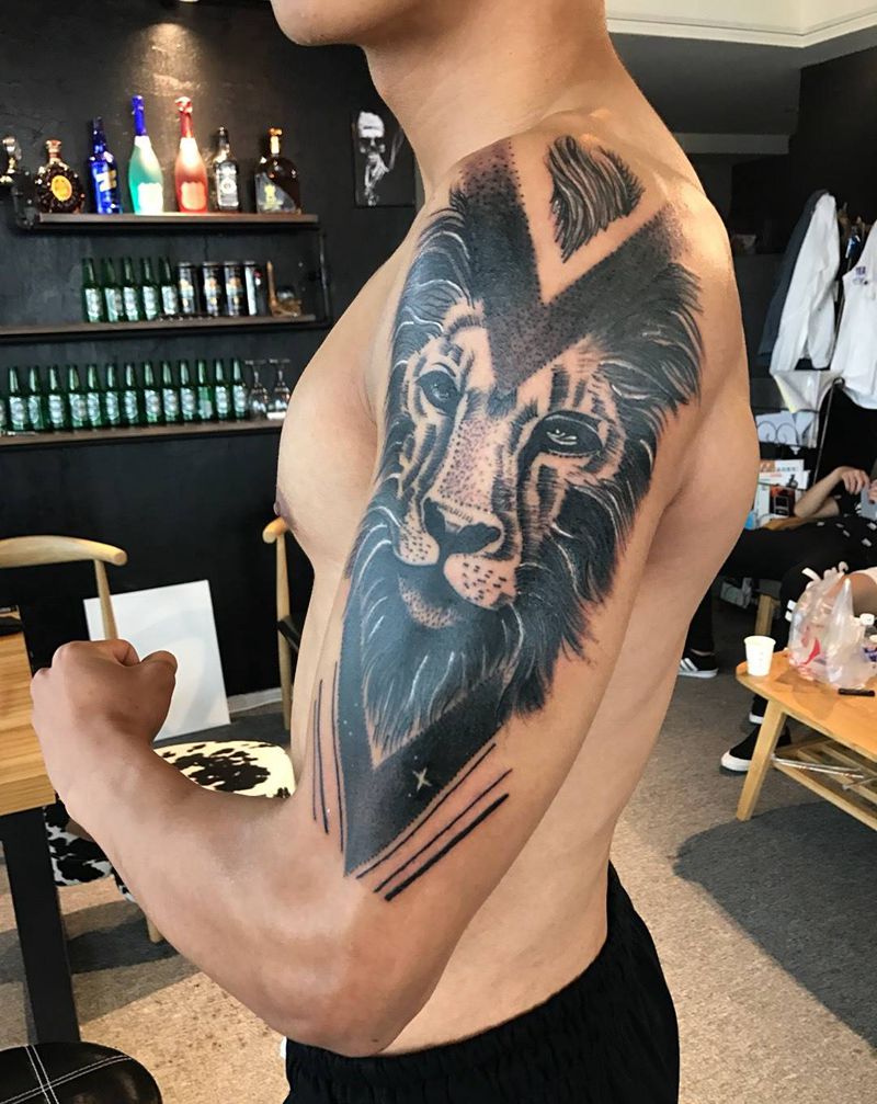 当前位置: 首页 >河南省郑州市纹身店-瘾刺青纹身图案>大臂狮子纹身图片