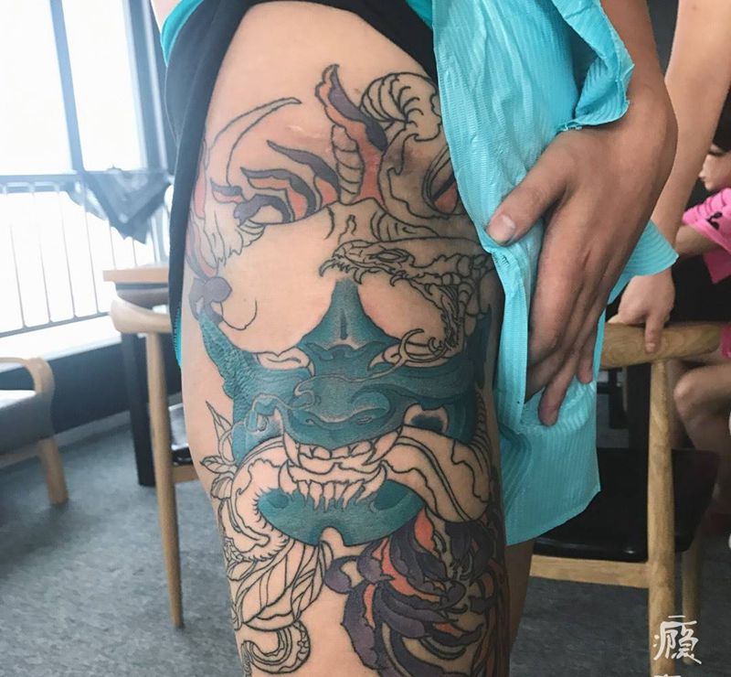 • T网红王老大花腿龙纹身图片_腿部新传统纹身图案