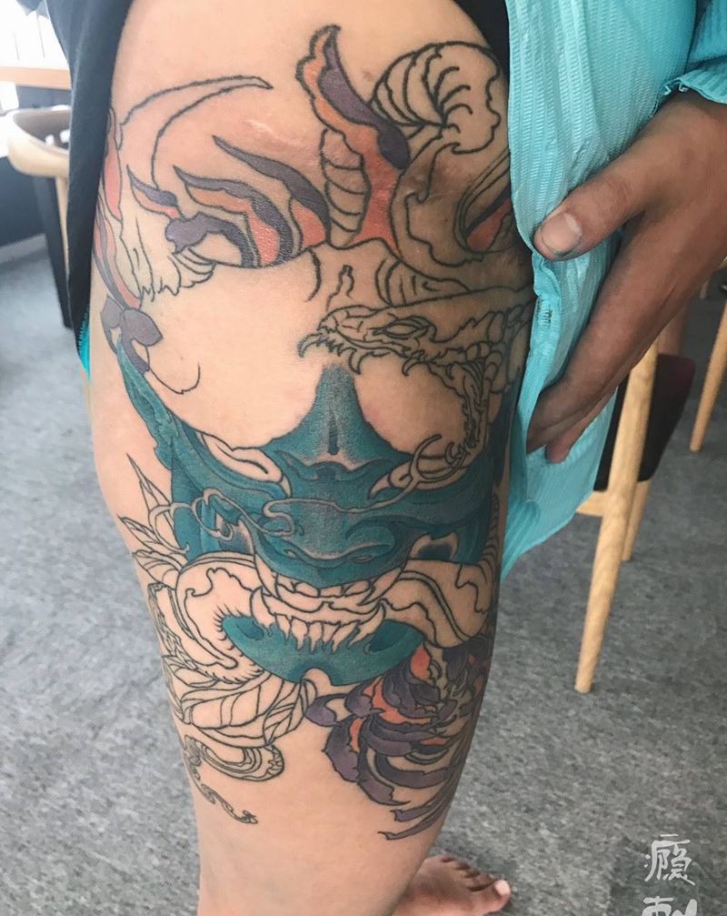 • T网红王老大花腿龙纹身图片_腿部新传统纹身图案